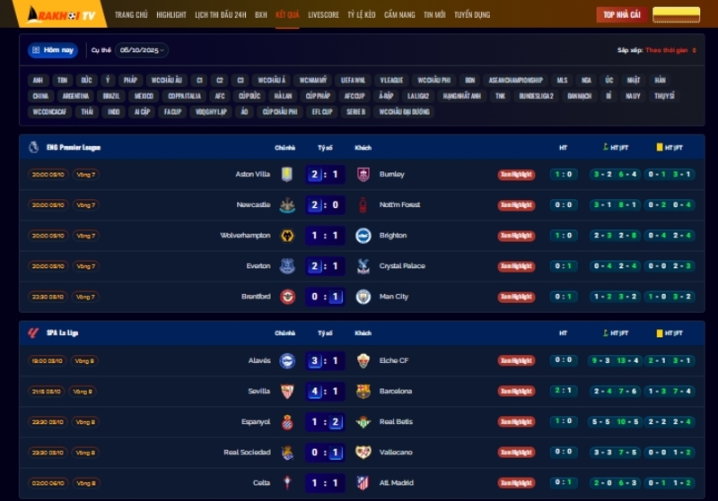 Ấn tượng đầu tiên khi mình vào RakhoiTV chính là cách họ trình bày phần ket qua bong da. Không màu mè, không chèn quảng cáo vô tội vạ, mà cực kỳ gọn gàng, có bố cục rõ ràng theo từng giải đấu.